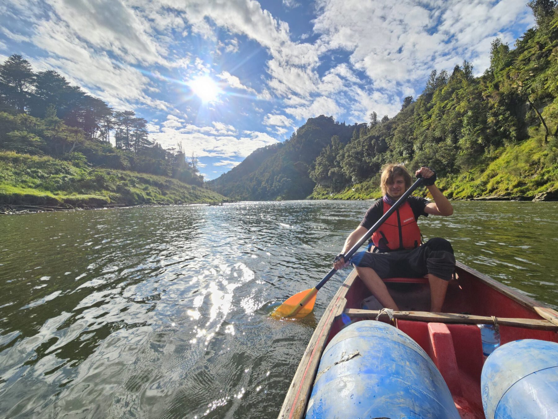 Am Programm stand als erster Punkt die Whanganui River Journey, die wir im Jänner verschieben mussten. Der Fluss Whanganui fließt vom Mt. Tongariro bis zur Tasmanischen See und ist für seine spirituelle Bedeutung für die Maori und atemberaubende Natur berühmt. In drei Tagen sind wir als Teil eines Great Walks über 90 km des Flusses abseits jeder Zivilisation hinunter gepaddelt. Nach zwischen fünf und sechs Stunden Rudern kamen wir am Campingplatz an und schlugen unser Zelt auf, kochten und machten es uns gemütlich. Abends spielten wir Karten mit anderen, die ebenfalls die River Journey unternahmen, und quatschen bis spät nachts unterm Sternenhimmel.