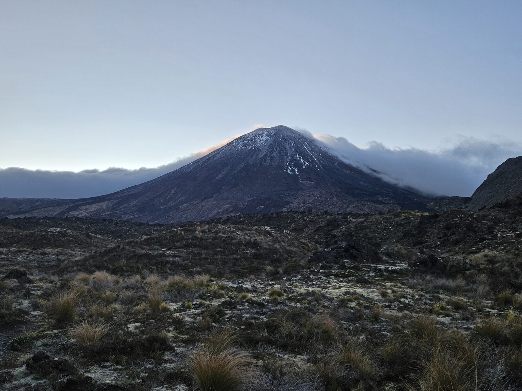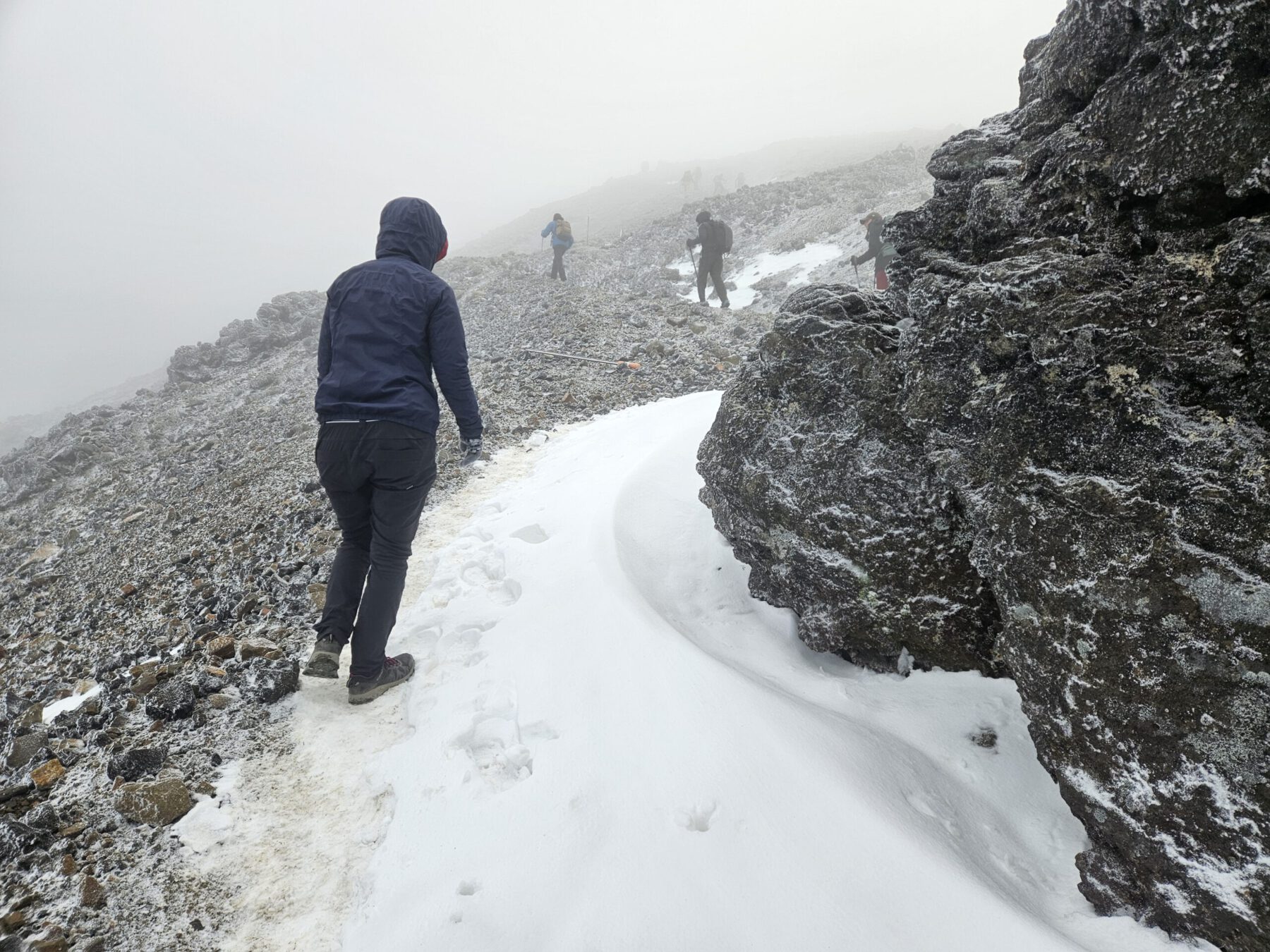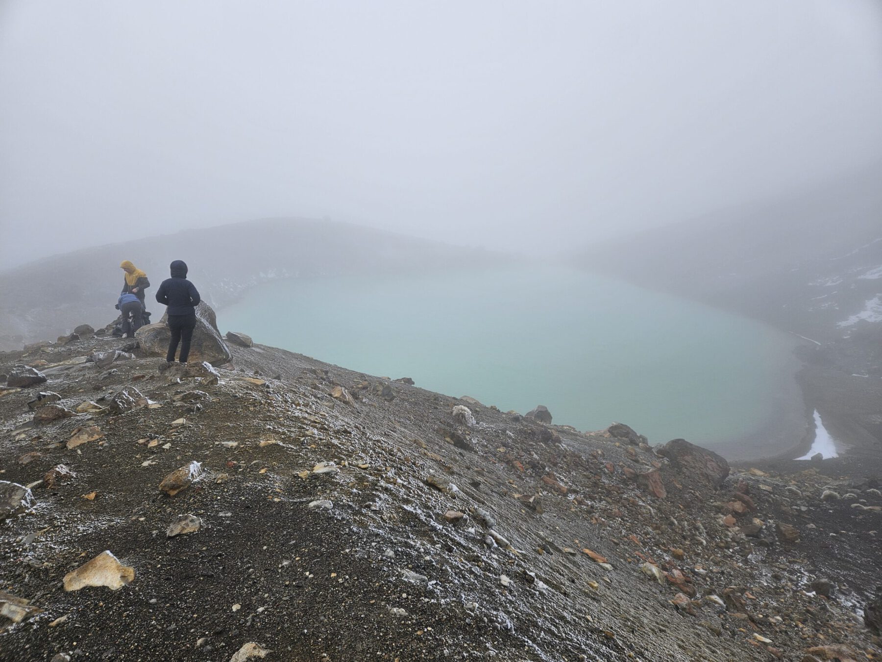 Ebenfalls einer der bedeutendsten Orte für die Maori ist der Berg Tongariro. Der aktive Vulkan ist bekannt für das spektakuläre Crossing vorbei am Mt. Ngauruhoe (aka Mt. Doom), rauchenden Kratern und Bergseen – welche wir im Nebel allerdings nur erahnen konnten. Aufgrund eines Sturms am Vortag erlebten wir die schwarzen Vulkanfelsen mit frischem Schnee bestäubt und bei beißender Kälte. Zum Glück haben wir für alle Witterung gepackt und konnten so erfolgreich Skiunterhose, Haube, Schal und Handschuhe zum Einsatz bringen.